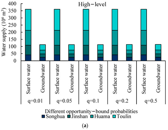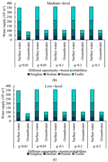 The constraints that the above multiobjective functions were subjected to are shown. Furthermore, random phenomena, such as the surface and groundwater supply amount in this study, commonly exist as uncertainty and random factors in irrigation water allocation systems; these random factors are always represented by the right-handed parameters, with stochastic features in the constraints of the optimising model. To address this uncertain phenomenon, CCP was selected in this study to solve the random phenomena in terms of the constraints of the optimisation module. CCP is an effective method used to address the random phenomena that exist on the right-hand side of the constraint through probability distribution.