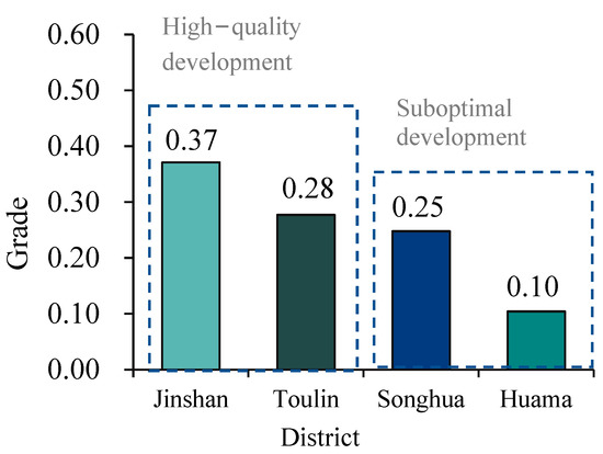 - Step 1: Obtain the original matrix for the original value of indicator for year ; is the evaluation indicator; is the study area partition (i (i = 1, 2, 3, …, n); j (j = 1, 2, …, m)).