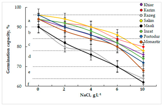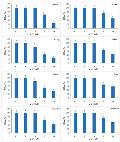 When adding the germination recovery to the initial germination capacity, i.e., eliminating the osmotic effect, the final germination capacity became very important until 10 g L−1 NaCl (Figure 5) was obtained. Until 4 g L−1 NaCl was achieved, GC reached its maximum (100%) in all cultivars, except for Razeg and Maali (82%). At severe salinity stress, the GC exceeded 80% at 6 g L−1 NaCl and 75% at 10 g L−1 NaCl in all cultivars, with respect to the previously observed genotypic differences.