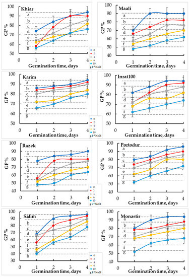 The daily monitoring of germination percentage (GP) showed a significant increase with time and reached its maximum earlier at low NaCl concentrations (after 2–3 days at 0–4 g. L−1 NaCl) than at high NaCl concentrations (after 4 days at 6–10 g L−1 NaCl) (Figure 2). However, increasing salinity stress significantly decreased germination rate (GR) in all cultivars, independently of NaCl concentration.
