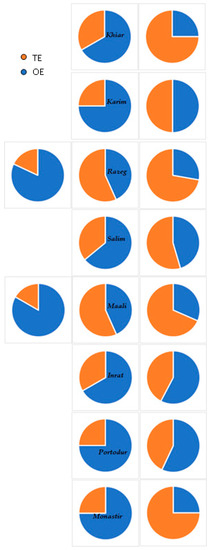 When transferred to deionized water, the germination recovery reached its maximum (100%) at low NaCl concentration in all cultivars, signaling that the main cause of germination inhibition is the OE, even if the TE appeared in Razeg and Maali at 4 g L−1 NaCl (did not exceed 20%). At high salinity stress (6–10 g L−1 NaCl), all cultivars start to lose their GRec, signaling the installation of the TE, which dominates in Razeg and Maali (TE > OE) at 6 g L−1 NaCl and in all cultivars at 10 g L−1 NaCl. These results allow us to suggest that we can overcome the inhibitory effect of salinity by dilution at the germination stage using fresh water. This technique allows us to reach a FGC of 95% at 6 g L−1 NaCl and 90% at 10 g L−1 NaCl in the most tolerant cultivars (Karim and Salim) and 84% at 6 g L−1 NaCl and 75% at 10 g L−1 NaCl in the most sensitive cultivars (Razeg and Maali). Previously, Bouzidi et al. [17] observed that Sulla carnosa suffers from difficulties with seed germination due to osmotic stress until 15 g L−1 NaCl is reached, which can be overcome by dilution. Beyond this concentration, the toxic effect dominates and irreversibly inhibits seed germination. They suggest that high accumulations of Na+ inhibit the activity of many enzymes and proteins, leading to cellular dysfunction. Tahjib-Ul-Arif et al. [39] reported that salinity disrupts the absorption of mineral ions and induces oxidative stress due to toxic ions. Patade et al. [7] demonstrated that germination is one of the most sensitive stages of the plant’s life cycle to salinity, whereas Hubbard et al. [13] added that seed germination and young seedling growth are the two most critical stages of the plant cycle.