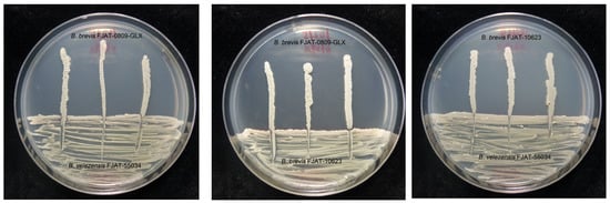 B. brevis strain FJAT-0809-GLX was isolated from soil in Yontai, Fujian Province, PR China. B. brevis strain FJAT-10623 was isolated from leaves of mandarin orange in Shunchang, Fujian Province, PR China. Bacillus velezensis strain FJAT-55034 was obtained from leaves of grapes in Fuan, Fujian Province, PR China. These strains were all isolated in our laboratory and cultured in Luria–Bertani (LB) medium [35,36].