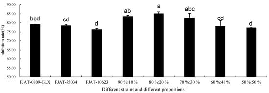 Inhibition rate of different microbial combinations against B. cinerea FJAT-32835 at 25 °C for 5 d. Vertical bars represent standard error. Values followed by different letters are significantly different according to Duncan’s multiple range test (p < 0.05).