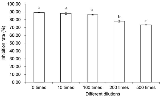 Inhibition rates of different dilutions of the mixed microbial combination against B. cinerea FJAT-32835 at 25 °C for 5 d. Vertical bars represent standard error. Values followed by different letters are significantly different according to Duncan’s multiple range test (p < 0.05).