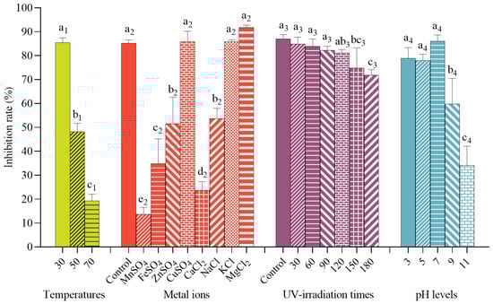Different heat treatments at various temperatures (30 °C, 50 °C, 70 °C, 100 °C, and 121 °C) were found to have an impact on the antifungal activity of the mixed microbial combination. The mixed microbial combination appeared to be insensitive to 30 °C but sensitive to higher temperatures. Its inhibition rates significantly decreased with increasing temperature (Figure 4). The mixed microbial combination displayed no antifungal activity at 100 °C or above.