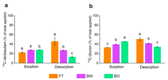 Hysteresis indices (H) close to 1 indicate that the sorption process is reversible and that desorption occurs in degrees very close to those of sorption [63] (Liu et al., 2010), whereas values less than 1 indicate an irreversible sorption process because desorption occurs with greater difficulty in releasing the sorbed herbicide [41,63]. Thus, the sorption process of diclosulam in BO straw has a higher degree of irreversibility, while the sorption of both herbicides is reversible in the other straws (Table 1, Figure S3). Hysteresis (H = 0.22–0.62) was found for herbicides, such as azimsulfuron, in soils with added biochar [21]. Irreversible sorption processes with H < 0.7 [41] imply reduced availability of the product in the environment through binding of the herbicide at sites with high affinity, and physical trapping of the molecule in sorbate structures [59].