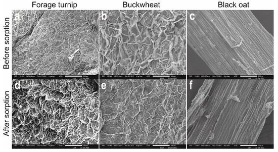 Scanning electron microscopy of the straws before ((a)—forage turnip, (b)—buckwheat, and (c)—black oat)) and after the sorption process ((d)—forage turnip, (e)—buckwheat and (f)—black oat)).