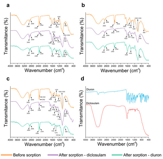 FTIR spectra of forage turnip (a), buckwheat (b), and black oat (c) straws before and after sorption with diuron and diclosulam. The graph in (d) represents the FTIR spectra of the technical products of diclosulam and diuron. The numbers represent the wavelength, and the arrows indicate the peak transmittance.