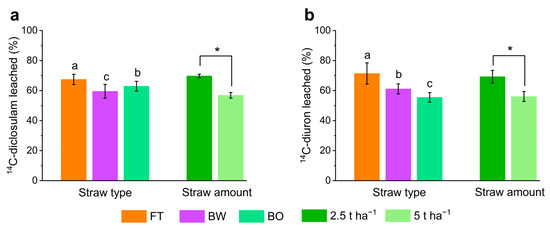 Amount of diclosulam (a) and diuron (b) leached as a function of straw types and amount after 60 mm rainfall. Bars represent the standard error of the mean (n = 4). Since the interaction between straw type and amount is not significant, lowercase letters differ between straws (regardless of amount) and asterisks (*) indicate differences between amounts (regardless of type) by Tukey’s test (p < 0.05). FT—forage turnip, BW—buckwheat, and BO—black oat.