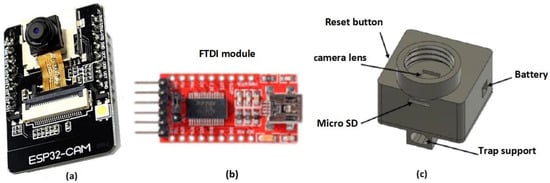 E-trap main components including the (a) ESP32-CAM, (b) FTDI module, and (c) screw tap support.