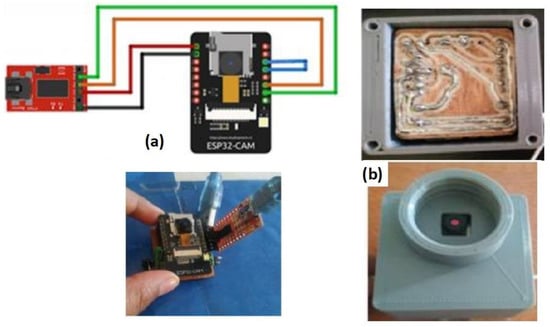 The program is uploaded to the ESP32-CAM module through the FTDI module, Figure 3a and the Arduino IDE 2.0 software employs “AI Thinker ESP32-CAM”. The TX and RX pins are connected and once the program is loaded, the blue-line bridge is removed and the flash is pressed. Finally, the red module is detached, keeping only the supply voltage from the external battery. Physical connections are shown in Figure 3a, and a phenolic plate (Figure 3b) keeps the ESP32-CAM protected.