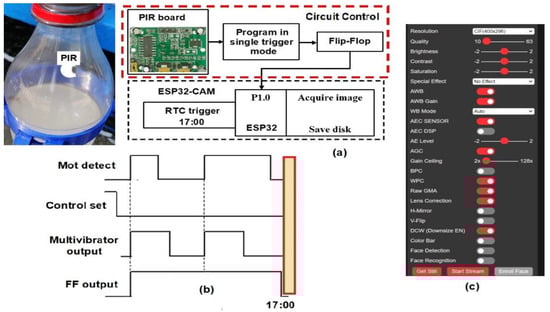 (a) Block diagram of the control system for acquiring images. (b) Control timing signals at the PIR board. (c) ESP32-CAM software settings.