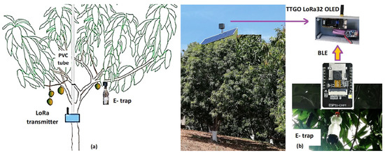 The number of flies are counted daily, and the information will be available to the producer through the LoRa transmission system, shown in Figure 5. The LoRa transmitter was fixed close to the trunk in Figure 5a and at the top of canopy at Figure 5b.