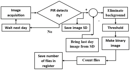 An 8-bit grayscale image was acquired every day at 17:00 by the ESP32-CAM, as explained earlier. If the PIR sensor detected an insect within the trap, the grayscale image was saved in a SD and binarized. The image stored from the previous day was subtracted from the actual image to remove the background pixelwise. Sixty grayscale images were inserted into the ImageJ 1.41 software (LOCI, University of Wisconsin, Madison, WI, USA) to obtain their histograms. These histograms were used to obtain the threshold value, to binarize the image. Once the flies were binarized, the dark images were counted, and the value was saved in a register within the ESP32.