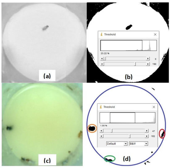 Figure 7a shows a grayscale image that has one fly and without eliminating the background by subtraction. The threshold value for binarization was 190, and the fly appears in black. All the CeraTrap liquid appears in white, and the PVC external vegetation gives a black value, shown in Figure 7b. Another RGB image presented three insects, an ant, a house fly, and a fruit fly, all floating over the yellow food bait, shown in Figure 7c. If we only wanted the insects to appear in the segmented area, two thresholds were used. The fruit fly is encircled in red while the housefly is surrounded by an orange circle (Figure 7d). Several new software’s are being developed to optimize segmentation in ImageJ [53,54].