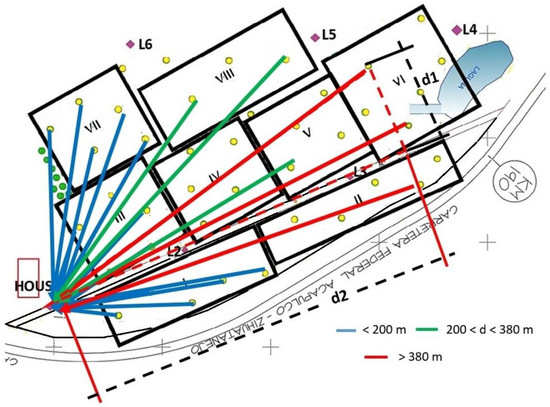 In the first WSN system, data was transmitted from each trap (node) to the LoRa receiver near the house (Figure 8). A point-to-point communication system was employed where the LoRa transmitter was at a height varying between 3 and 5 m based on the tree trunk and branches. The receiver was placed at a height of 20 m over the house tower. The receiver module measured the RSSI, and the transmitting packets presented up to 20 bytes of data information; two bytes correspond to the tree number and the other byte to the quantity of flies. Packet loss was determined as the percentage of bytes of information received against the total number of bytes sent. Blue lines in Figure 8 represent distances below 200 m between traps and house tower. Green lines represent those traps that have a distance higher than 200 m and lower than 380 m to the LoRa receiver. Red lines present distances between the trap transmitter and the house receiver longer than 380 m. Provisional values of trapped flies were inserted into the embedded system to test the efficiency of the communication system.