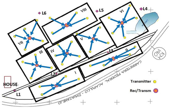 The second LoRa static transmission system presents a star topology (Figure 9). Each hectare marked with a black square or rectangle presents a star topology network with a receiver at the center of four or five transmitting traps (nodes). Each nearby trap (node) can be connected to a central gateway so that all data packets are aggregated to it without coordination between them [60,61]. The LoRa transmitters were initially placed over the trap at a height of 5 m and the LoRa transceiver fixed at a height of 20 m over a tower; each tower was placed at the middle of a hectare (square center).