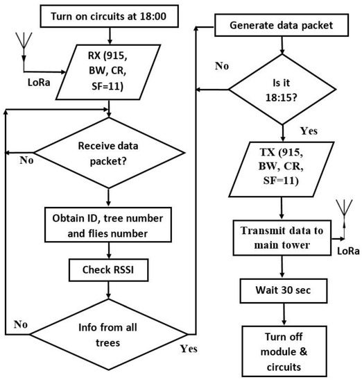 The TTGO LoRa32-OLED V1 module at the top of the tower works as a transceiver and has the ability to receive and transmit data. The module was programmed with Arduino IDE, and the block diagram illustrates the constants used by the LoRa transceiver (915 MHz, CR = 4/5, BW = 125 kHz, SF = 11), shown in Figure 10. The data is collected daily at 18:00 when the system is reset and wakes from its sleeping routine. The system starts receiving data from each trap at 18:00. The first trap (node) will transmit data for 2 min, and the embedded system decodes the data package (Figure 11) which contains tree number 41 and the quantity of flies being trapped (3). In the example of Figure 11, each trap will transmit at a different time towards the receiver-end node fixed at the tower. The resultant packet elaborated by the TTGO LoRa32-OLED V1 module has 8 bytes (41 03 48 00 57 02 63 05) with the black bytes as the tree number; the next byte, shown in red font, is the number of flies (Figure 11). Once the data is encoded the package is transmitted to the main tower at 18:15, shown in Figure 10. After 30 s, the system will go to sleep until next day. The module uses only one antenna for both receiving and transmitting.