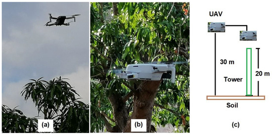 (a) UAV flying over the trees in open space. (b) UAV returning from the route. (c) UAV heights during data acquiring routine.