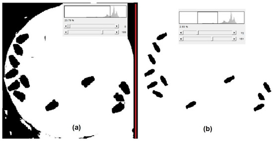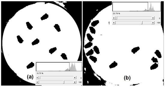 In the afternoon, the best threshold (Th2 = 122) showed flies in black on a white background. The pixels surrounding the trap’s polyurethane circle within the image remained black (Figure 15a,b). With Th1 = 83 in the afternoon, this contour became white, and the fruit-fly area decreased by 42%; detection efficiency was still 100%. With a higher threshold of 149, efficiency decreased to 12.5% and the ellipsoidal fly shape became square. At noon, with a threshold Th2 of 212, fly detection accuracy was 100%, but the outer contour from the PET bottle image became white. Two black small figures similar to flies were found outside the circle with Th1 = 83, reducing the detection efficiency to 75%; each fly area decreased by 64%. In the morning, the best threshold was Th2 with a value of 187. For Th1 = 155, the detection efficiency and fly area decreased to 75% and 57%, respectively.