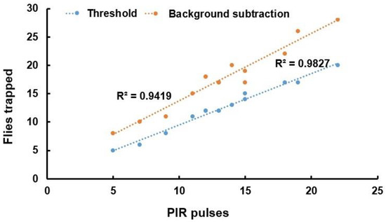 A 0.9827 correlation was obtained between the insect count from threshold-based binarization and PIR pulses and is shown with blue line. An R2 = 0.94 with background subtraction was obtained, but the slope was higher. A higher quantity of flies resulted from subtraction imaging as the flies do not remain in the same location. For example, PIR counted 19 flies while the subtraction image algorithm counted 26.