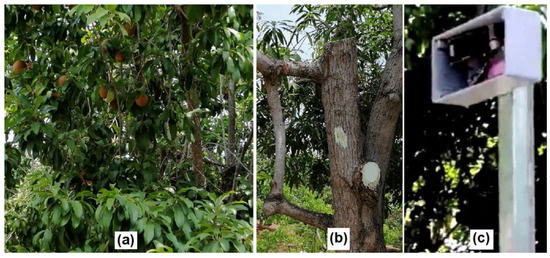 In this star topology experiment, distance from the transmitter to the receiver ranged from 50 to 60 m. The transmission crossed through several branches, affecting the strength of the signal (RSSI) that was reaching the ESP32 LoRa module. Several trunks were gathered to provide a diameter section of 0.6 m, providing an RSSI = −114 dBm within safe limits, but there was also a 63% data packet loss (Table 4). Trees were pruned to avoid transmission problems, shown in Figure 18a,b. Dense vegetation included trunks, leaves, and branches, but trunks and thick branches attenuated the electromagnetic transmission considerably. The LoRa transmitter was taken to the top of the tree (Figure 5b and Figure 18c), minimizing data package-loss within the system. Communication between the orchard and house tower took place within open space, shown in Figure 9.