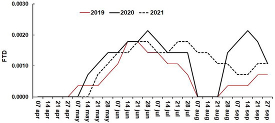 The fruit flies per trap per day index (FTD) determined plant health and its infestation according to the National Campaign against Fruit Flies (NCFF). The index was calculated from the number of fruit flies caught within all the traps per day [65].