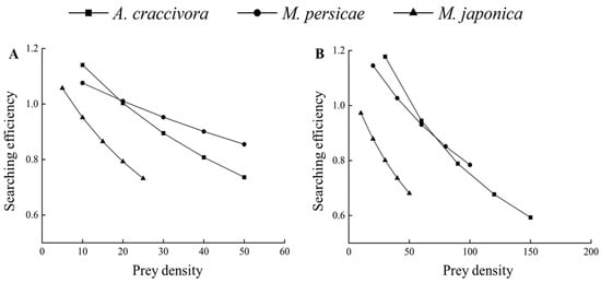 S of the second- and third-instar larvae on these three species of aphids gradually decreased with an increase in prey density, and when the prey density was the same, the