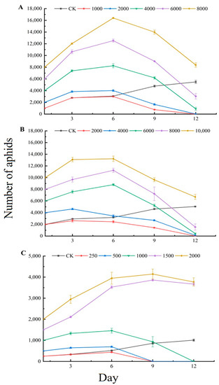 Table 2). The experiment was repeated 3 times per treatment; 3 pots of broad bean seedlings were used per replicate, and there were 20 plants per pot. The numbers of aphids, eggs, larvae, and pupae were investigated on days 3, 6, 9, and 12, and the rate of aphid population decline was calculated. Population decline rate (%) = [(No. of pre-treatment insect population − No. of post-treatment insect population)/No. of pre-treatment insect population] × 100.