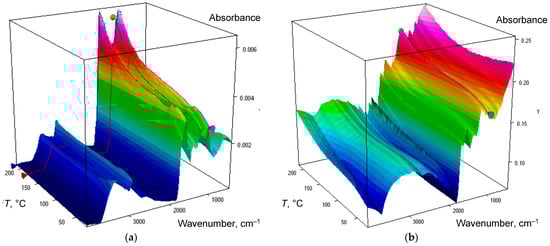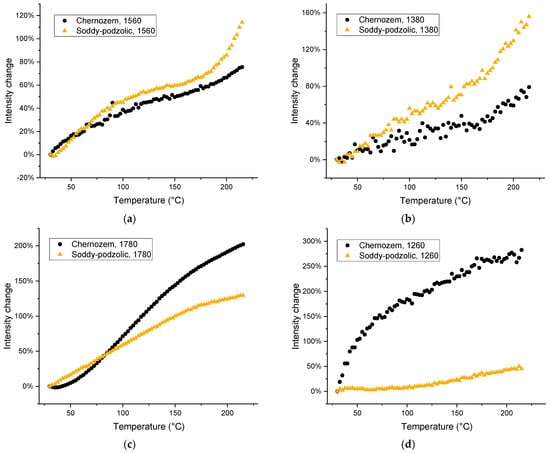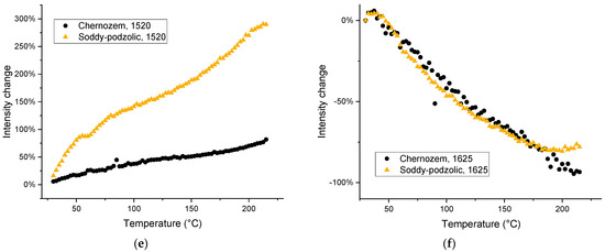 The bands corresponding to acidic groups show an increase in the intensity and the same behavior for both antisymmetric and symmetric bands (Figure 10a–e). Amide bands (1265 and 1510 cm−1) have the same amplitude and behavior. Soddy podzolic soil shows more difference between these bands compared to chernozem (Figure 10). On the contrary, the band at 1630 cm−1 (water) shows an opposite behavior, a decrease over the whole studied range, which is quite similar by the scale for both HS samples (Figure 10f). For soddy podzolic soil, three stages can be seen: up to 60 °C with the highest slope, and 60−180 °C, with a slower decrease equal to the decrease for chernozem. Over 180 °C, there is no decrease for soddy podzolic HS, while chernozem HS retains the same slope.