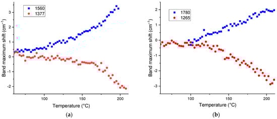 Temperature shifts in maximum positions corresponding to (a) carboxylate bands, 1560 and 1380 cm−1 and (b) carboxylic acid bands, 1780 and 1265 cm−1 for HS from soddy podzolic soil.