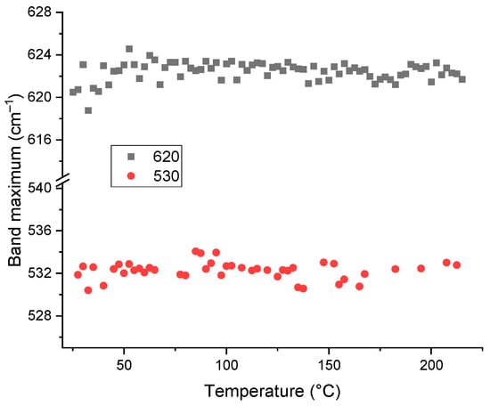 In the region of fundamental SiO2 vibrations (650–400 cm−1), lattice vibrations of the matrix at 620, 540–535, and 510 cm−1 (Si–O–Si), 470, 450, 430, and 394 cm−1 (O–Si–O) do not show any shifts following the behavior of fundamental vibrations (Figure 9). The band at 697 cm−1 (as a counterpart of the lattice vibration at 354 cm−1 [73]) shows a blueshift of +3 cm−1, which agrees well with the thermal behavior of this band for brown-coal HS [39].