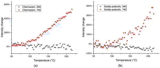 Thermal behavior of the integrated intensities of bands (a) 750 (red line) and 540 cm−1 (black line) for HS from (a) chernozem and (b) soddy podzolic soil.