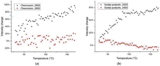 For the bands corresponding to both HSOM and residual SiO2, dependences of integral intensities of the same bands in chernozem and soddy podzolic HS show similar behavior. This is correct for CH2 bands (3000–2800 cm−1), the main bands in HSOM region (Figure 12) and in the subranges with band attribution to the SiO2 matrix (Figure 11). Changes in the intensities of bands corresponding to SOM contributions are manifested in some cases significantly stronger in soddy podzolic soil compared to chernozem (Figure 12a,b).