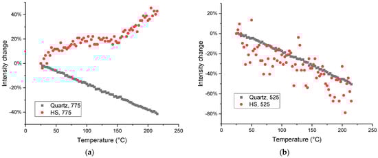 Thermal behavior of the integrated intensities of bands of (a) 775 and (b) 525 cm−1 in quartz (dark gray squares) and HS isolated from soddy podzolic soil (red dots). The high deviations in the case of the band at 525 cm−1 in humic substance sample is due to the very low intensity of this band (a low concentration compared to pure quartz).