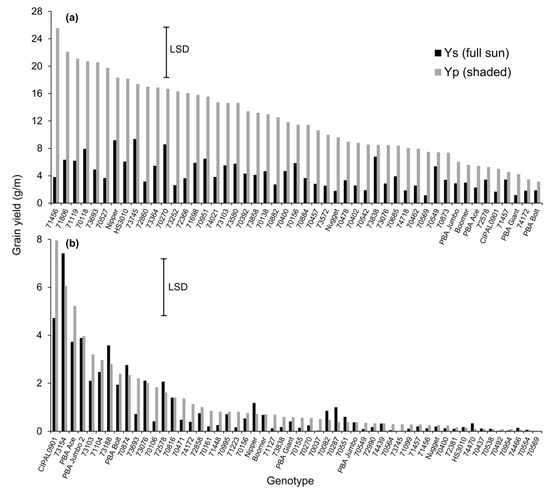 The yield stability index (YSI), which is the ratio of YS and YP, varied significantly across the genotypes tested (Figure 4a). For example, the genotypes 71457, 73838, 70549, 72578, and PBA Bolt were relatively stable across contrasting temperature treatments (high YSI). In contrast, the genotypes 73572, 71456, 70569, 70527, 72860, and Nugget had a low YSI indicating low yield stability for the YS temperature treatment. The commercial cultivars PBA Bolt, Boomer, PBA Jumbo, and PBA Ace had a moderate YSI, although the absolute yield was relatively low when grown under hotter conditions (Figure 3a).