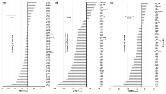 Ranking of yield stability index (YSI) (a), stress tolerance index (STI) (b) and high-temperature tolerance index (HTTI) (c) based on grain yield for the 49 genotypes screened in 2014. Indices presented are for log10 transformation. Least significant difference (LSD) for genotype comparison (p < 0.05).