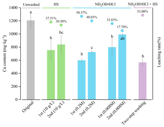 Changes in total Cu content in the soil before and after washing/washing cycles treatments with NH2OH·HCl, HS, NH2OH·HCl + HS. Different letters between the original soil and soil washed with agents indicate significant differences (p < 0.05) in the residual content.