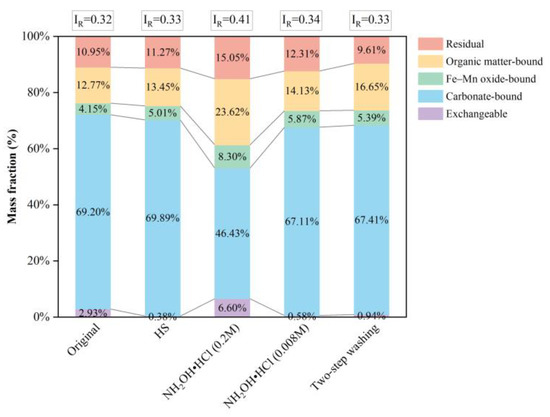 Soil washing significantly impacted Cu distribution and stability in soil. Before washing, Cu was predominantly present in the unstable carbonate-bound fraction (69.2%) of the soil, as shown in Figure 2. This is consistent with previous studies showing that Cu in the soil around smelters is mainly found in the mobile fraction [31]. The HS solution washing reduced the unstable exchangeable Cu (EX-Cu) fraction from 2.9% to 0.4%, with the content of EX-Cu being 1.42 mg·kg−1 in soil. Bi et al. also found that the HS provided plenty of adsorption sites for heavy metals [32].