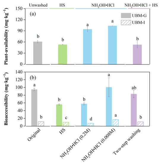 Plant availability (a) and bioaccessibility (b) of Cu content after soil washing. Different letters present significant differences according to Tukey’s test (p < 0.05).