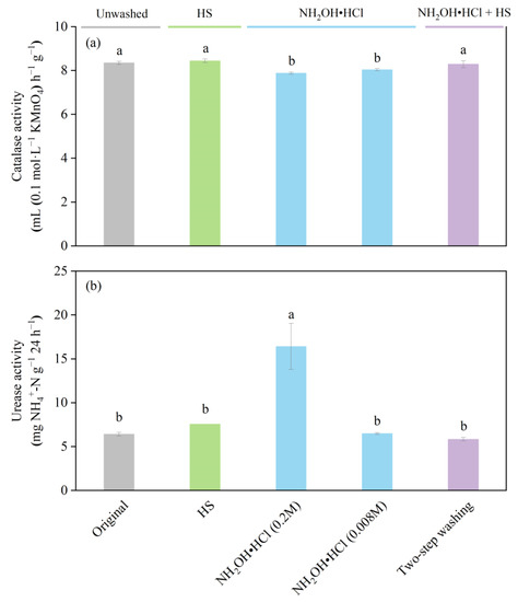 Soil enzyme activities ((a) catalase activity and (b) urease activity) tests after soil washing. Different letters present significant differences according to Tukey’s test (p < 0.05).