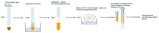 Alkane was determined according to the method of Mayes et al. [7], Sun et al. [24], and Dove et al. [25], with some modifications. Briefly, 2 g of plant or 1 g of fecal sample was weighed into a pyrex bottle with three replicates; two internal standards (2 mg C22 and 2 mg C34) and 15 mL ethanolic KOH (1.5 mol/L) were added to each sample. The tubes were capped tightly and heated for 4.5 h at 90 °C. The extraction of alkanes was performed by adding 7 mL heptane plus 5 mL distilled water, with ultrasonic treatment for 5 min, followed by transferring the heptane layer to an evaporating dish. The extraction was repeated twice with 5 mL heptane. The evaporating dish was heated in a water bath at 60 °C and the heptane solution was evaporated to approximately 1 mL. The solution was then transferred into a silica gel column (70–230 mesh), and the dish was rinsed four times with 2-, 2-, 3-, and 4-mL heptane. The lipid in the sample was absorbed into the gel, and alkanes were eluted. The eluate was collected in a tube, blown dry using nitrogen, and reconstituted in 1 mL heptane for the determination of alkane concentrations (Figure 1).