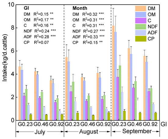 Most studies estimate livestock intake based on the analysis of representative samples of daily fecal output because it is laborious and prohibitive for large-scale experiments. Total collection of feces also obviates the need for markers to measure fecal output. Thus, in the current study, we collected total fecal output, fed the livestock without additional markers, and measured the alkanes in the feces to determine the amount of forage taken by the livestock. We found that as grazing intensity increases, the amount of dry matter taken by livestock gradually decreases. This may be explained that as grazing intensity increases, interspecific competition for livestock increases, the grazing resources will decrease, and livestock feed intake will decrease as observed in light grazing. Similarly, as grazing intensity increases, livestock forage time increases, single-mouth intake decreases, and highly palatable forage decrease, so daily intake decreases. Therefore, lower forage intake and animal nutritional status under high stocking rates are explained by lower forage availability [28]. We also found that livestock feed intake was highest in September, probably due to the fact that local temperatures in the study area were already significantly lower in September than in July and August and that livestock need to feed more to meet their energy requirements in cold conditions.