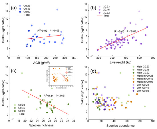 The relationship between livestock intake and vegetation. Cattle intake with AGB (a), liveweight (b), species richness (c), and species abundance (d).