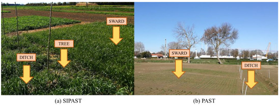 The experiment complied with a two-factor randomized complete block design (RCBD) with three replicates (each plot sizing 56 m2). The first factor (CROP) included two different swards: (i) sulla (SUL) cv. Silvan, (ii) ryegrass (RYE) cv. Teanna. The second factor (SYSTEM) included two different cropping systems: PAST, i.e., a specialised pastoral system with forage crops grown without intercropped trees, and SIPAST, a silvo-pastoral system with poplar (clone I-214) tree rows planted, North-South oriented, between the ditch and the forage crop. Five poplar trees have been planted on the row every 2 m along one side of each plot (plot length: 8 m), 2 m away from drainage ditches, and 1 m apart from the first row of the forage crop.