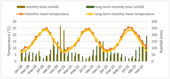 October 2019–May 2022 and long-term (1993–2021) monthly total rainfall (mm) and mean air temperature (°C), San Piero a Grado (Pisa, Italy).