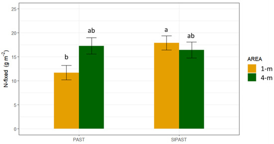 Averaged over the two experimental years/fields, AGB and Nyield resulted significantly higher for SUL than RYE (+19% and +65%, respectively for AGB and Nyield) (Table 1). Although not significantly, the average value of the area showed increased AGB value at 4-m position (645.44 vs. 551.71 g DM m−2 for 4-m and 1-m respectively). Nyield and Nfixed did not show significant differences or any clear tendence regarding the averaged values of System and Area. Figure 3 shows the average AGB value in each System × Crop treatment, averaged over the two years/fields. In the SIPAST system, sulla resulted significantly more productive than ryegrass (695.09 vs. 461.44 g DM m−2), while the two crops were not statistically different from each other within the PAST system, nor with the two crops grown in the SIPAST system. Figure 4 shows the 2-year average value of Nfixed for sulla grown in each area of sampling in each system treatment. Within each cropping system, no differences were found in the amount of fixed N between the two areas, but in SIPAST-1-m Nfixed was higher than PAST-1-m (17.89 vs. 11.70 g N m−2).