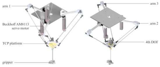 We implemented low-level control on the Beckhoff CX5140 (Beckhoff Automation GmbH & Co. KG, Verl, Germany) programmable logic controller, using three Beckhoff EL7211 servo motor controllers to control the delta robot’s motors, two Beckhoff EL7201 (Beckhoff Automation GmbH & Co. KG, Verl, Germany) servo motor controllers to control the track motors, and the Beckhoff EL7342 (Beckhoff Automation GmbH & Co. KG, Verl, Germany) 2-channel motion interface for the DC motors. The motor controllers were configured to accept velocity as the reference input, in order to facilitate motor control. The frequency of the control loop was 1 kHz.