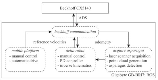 Schematic representation of high-level control, based on ROS. The main functionalities were covered by four packages: Beckhoff communication, for communication with PLC; mobile platform, for control of the mobile robot; delta robot, covering the modalities for the delta robot; and acquire asparagus, for processing sensory data and asparagus detection.