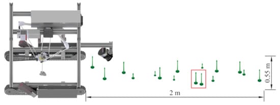 The delta robot was mounted on a mobile platform with two rubber tracks that provided traction for field driving. The distance between the tracks was 600 mm, providing sufficient space for traversing asparagus fields. The outer dimensions of the mobile platform, excluding the sensor, were (length × width × height). The sensor bar added to the overall length when it was included. The tracks were propelled by a Beckhoff AM8131 (Beckhoff Automation GmbH & Co. KG, Verl, Germany) synchronous motor with a combination of angular and chain reduction resulting in a total ratio of 70:1. This configuration permitted the platform to attain a nominal speed of m/s.